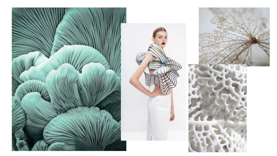 How will technology impact us next? Will we be able to print our own garments from the comfort of our own home? “Modern Progressive” is a cohesive culmination where technology meets sustainability, creating a new age in fashion. With the innovation and increased accessibility of 3D printers the waste of excess material is eliminated. With the increased use of innovative plant based materials there is a greater focus on sustainability. The advancement of this technology eliminates waste and produces a more durable product. Organic, structured shapes can be created, influenced by shells and patterns found in nature, creating futuristic structured pieces.